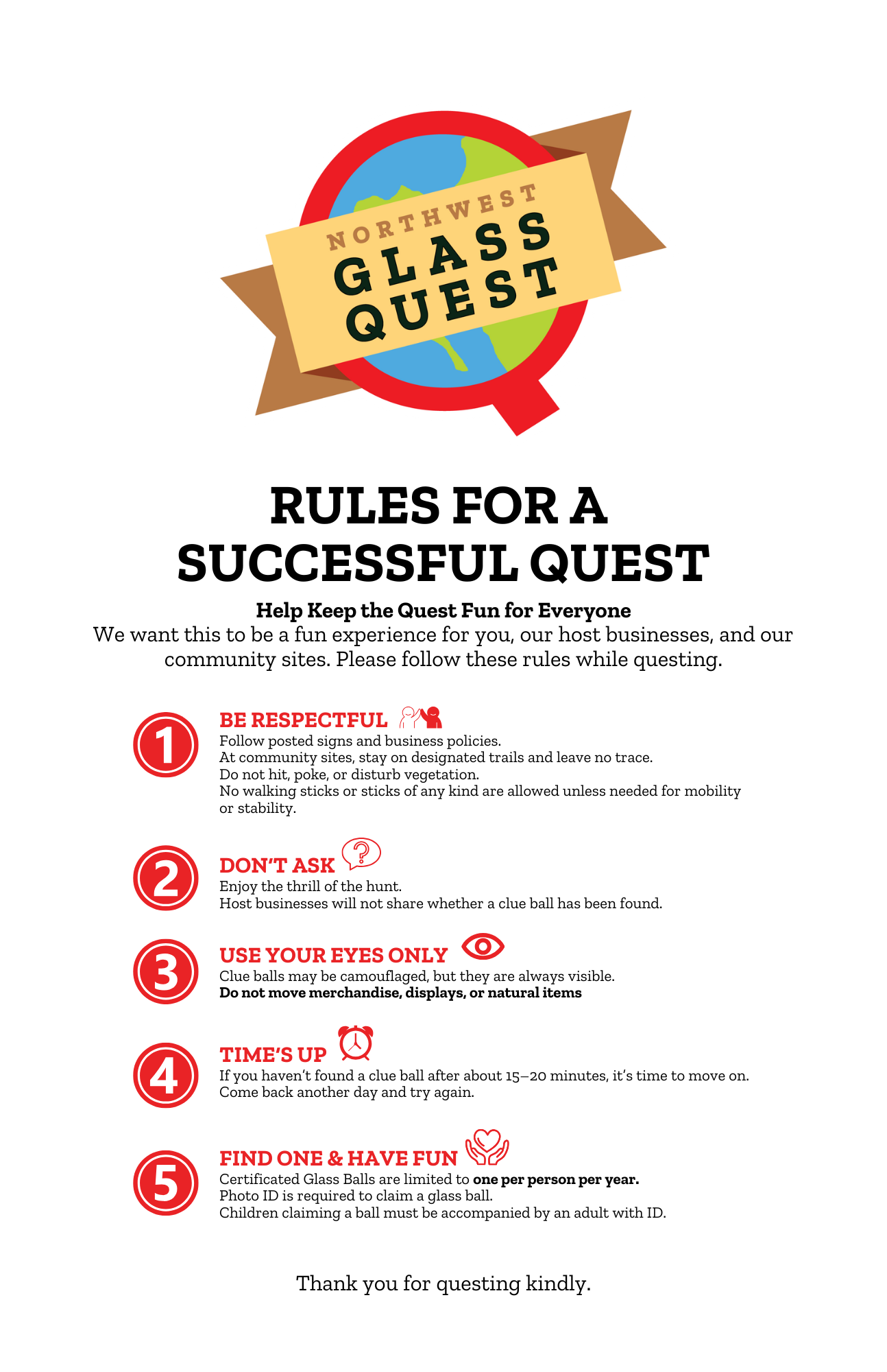 In lieu of kid questing events, we have launched our Kind Quester Program encouraging you to engage in the event in a meaningful way. This is fun for kids of all ages and embraces the spirit of the event - have fun with it! Learn More Here: https://www.northwestglassquest.com/kind-quester